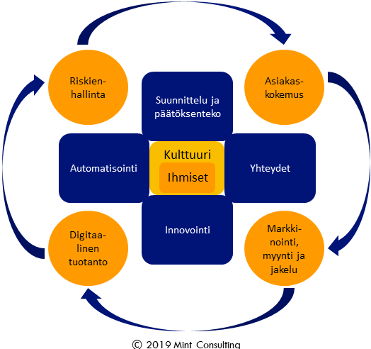 Asiakaskokemus on toiminnan kulminaatiopiste; antoisa ja yhtenäinen asiakaskokemus monikanavaisessa palvelukokonaisuudessa on hyvä tavoite. Digitaalisessa maailmassa on vakavasti harkittava 24/7 palvelua. Digitaalinen markkinointi, myynti ja jakelu tuovat parempaa laatua ja tuottoa. Perinteisten kanavien toimintaa voidaan kasvattaa digitaalisin keinoin. Tuotanto on luonnollisesti täysin digitaalisesti ohjattua ja pitkälle automatisoitua. Myös virtuaalinen asiakaspalvelu ja hallinto voidaan nähdä osaksi digitaalista tuotantoa. Riskienhallinta tukeutuu suureen datamäärään, digitaalisiin palveluprosesseihin sisällytettyihin ja automatisoituihin kontrolleihin. Riskienhallintaa on myös markkinoinnin ja myynnin parempi kohdistaminen omaan palveluhistoriatietoon ja ulkoisiin tietolähteisiin perustuvan kohderyhmämäärittelyn kehittyessä.