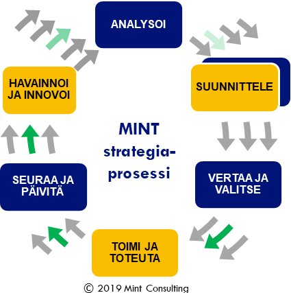 Digiajan suunnitteluprosessin kuvaus poikkeaa aiemmista mm lisääntyneen nuolimääränsä vuoksi. Suunnittelu on edelleen suunnittelua digiaikanakin, aivan kuten business on businesta, niitä tehdään nyt uusilla tavoilla ja välineillä. Nuolet kuvaavat sitä, että havainnoitavia asioita ja mahdollisia etenemispolkuja on merkittävästi enemmän kuin aiemmin. Ne kertovat myös, että yksin valitun strategian (vihreä nuoli) toteutus ja seuranta ei riitä, vaan rinnalla on pidettävä ajantasaisina myös tärkeimmät vaihtoehtoiset strategiat. Valittu strategia himmenee aina kierroksen edetessä ja päätyy olemaan valintavaiheessa samanarvoinen uusien tai uudistettujen vaihtoehtojen kanssa. Se saattaa tulla toki myös uudelleen valituksi.