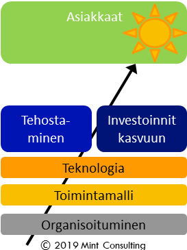 Tahtotila eli tavoite on kirkkaana ohjaamassa suunnittelua ja toimintaa. Suunnittelussa keskitytään joko tehostamiseen tai uudistumista ja kasvua tukeviin investointeihin. Tehostaminen tarkoittaa tuloksellisuuden nostamista, kustannusten leikkaamista tai toimintojen/liiketoimintojen myyntiä/ostamista tai ulkoistamista/sisäistämistä. Investoinneissa olennaista on priorisointi ja niiden uusien kyvykkyyksien ja osaamisen hankinta, jotka tuottavat parasta tulosta. Teknologia on tämän hetken suurin muutoksen mahdollistaja. Toimintamallit muuttuvat ja kehittyvät nopeaan tahtiin, samoin organisaatio ja organisoituminen.